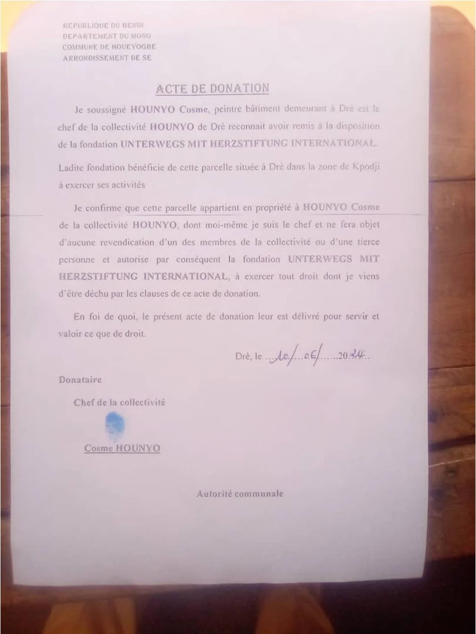 Der Stiftung «Unterwegs mit Herz» wurde am 10. Juni 2024 ein Land in der Grösse von 1.05 ha von unserem geistigen Bruder Hounyo Donald geschenkt. Das Grundstück befindet sich in Dré, in der Nähe von Comé in Benin/Afrika mit einer guten Verkehrsanbindung, einem angrenzenden großen Fluss mit Fischbestand. Das Land ist nicht weit vom Atlantik und dem Flughafen entfernt.